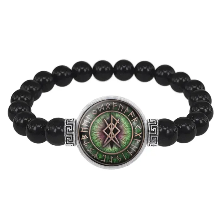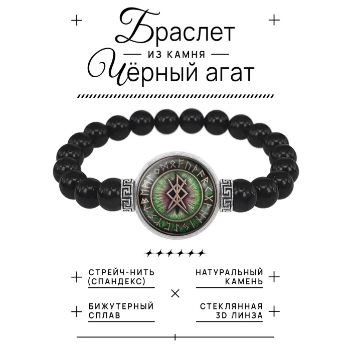 Стрейч-браслет из бусин чёрного агата с центральным элементом в виде рунического амулета под стеклянной линзой.