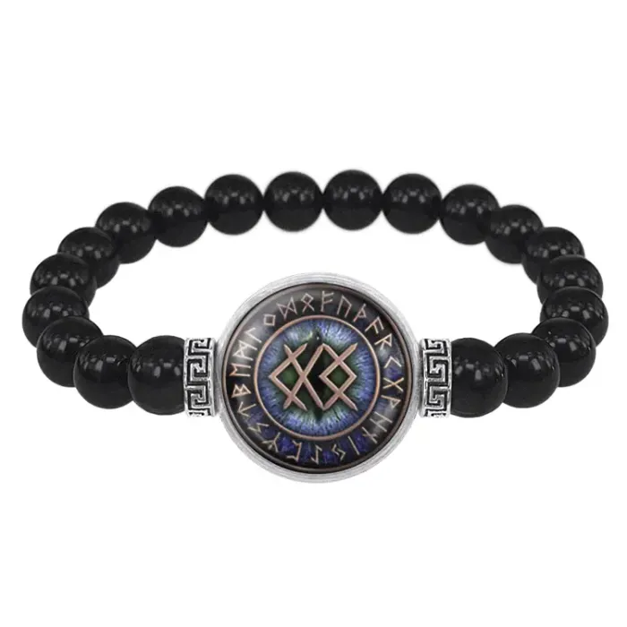 Мужской стрейч-браслет-амулет из бусин чёрного агата с выпуклой стеклянной линзой, на которой нанесены рунические символы.