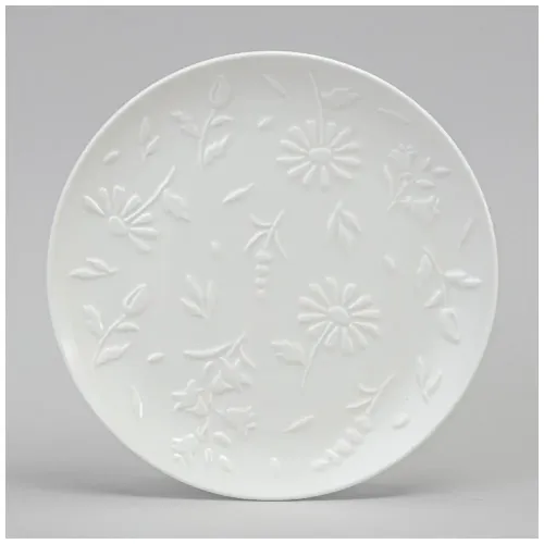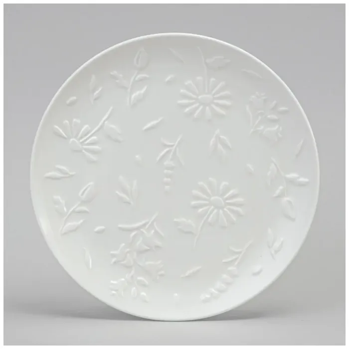 Тарелки выполнены из упрочнённого фарфора, что обеспечивает повышенную прочность. Поверхность украшена декором с изображениями ромашек, колокольчиков и лаванды, нанесённым под глазурь. Рельефный дизайн по краю тарелки является декоративным элементом коллекции.
