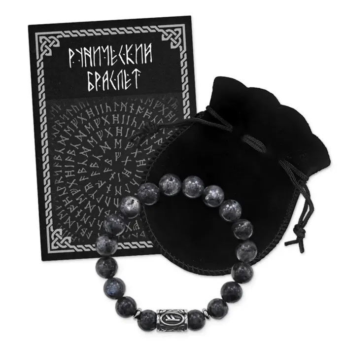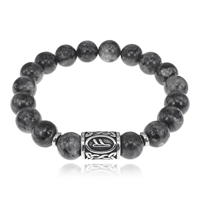 Стрейч-браслет ручной работы из натурального камня лабрадор и бусин из нержавеющей стали с руническим символом Феху.