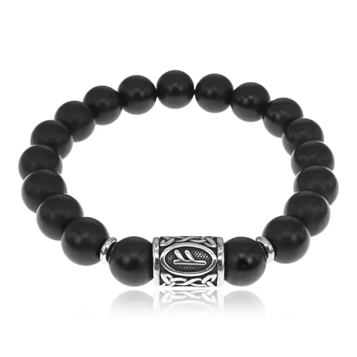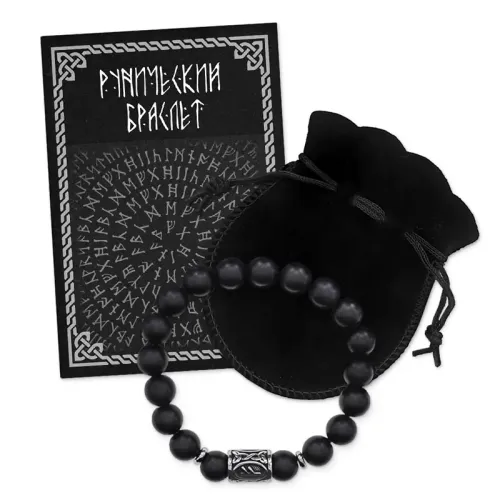 Стрейч-браслет ручной работы из натурального шунгита и бусин из нержавеющей стали с руническим символом.