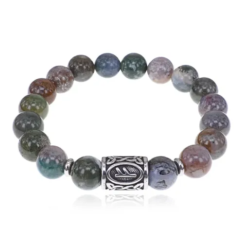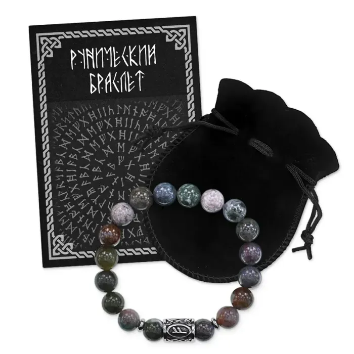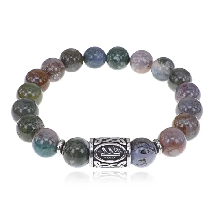 Стрейч-браслет ручной работы из индийской яшмы и бусин из нержавеющей стали с руническим символом.