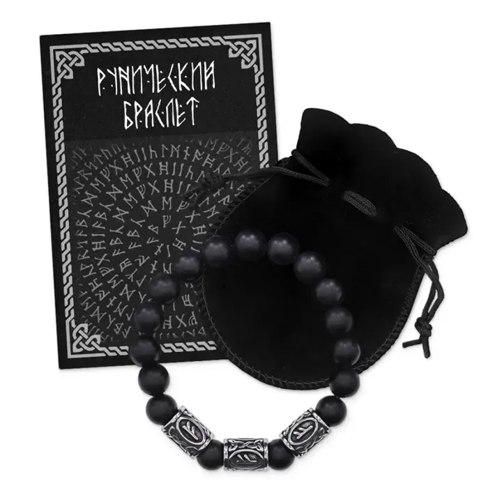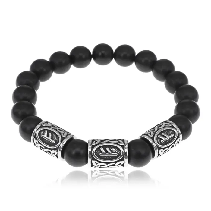 Стрейч-браслет ручной работы из шунгита и бусин из нержавеющей стали с руническим символом.