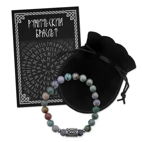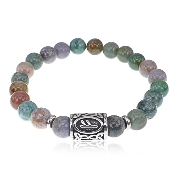 Стрейч-браслет ручной работы из индийской яшмы и бусин из нержавеющей стали с руническим символом Феху.