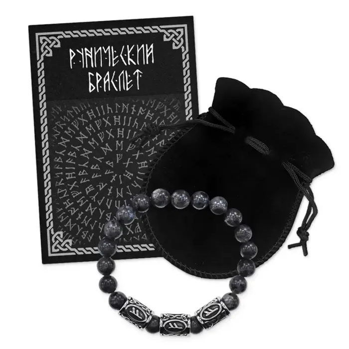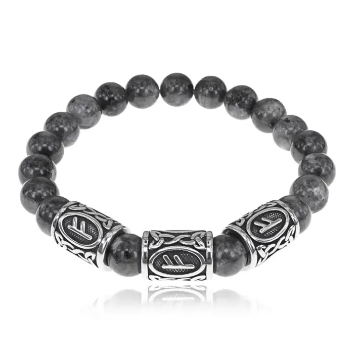 Стрейч-браслет ручной работы из натурального камня лабрадор и бусин из нержавеющей стали с руническим дизайном.