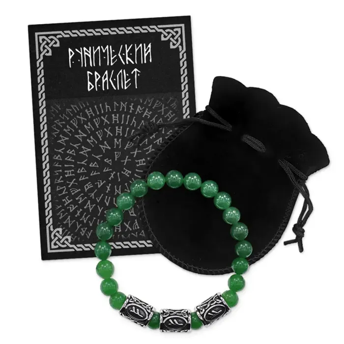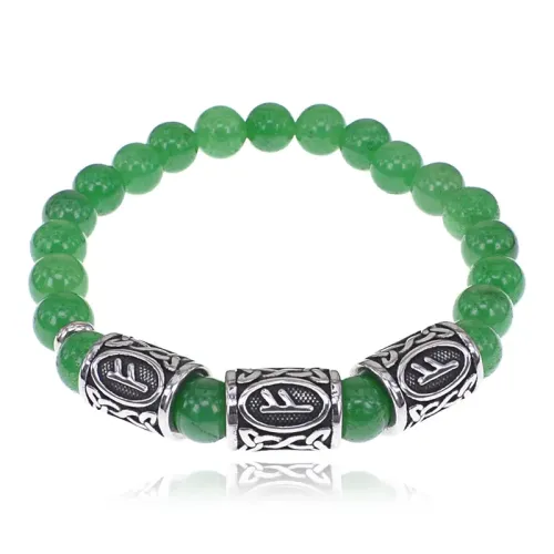 Стрейч-браслет ручной работы из натурального нефрита и бусин из нержавеющей стали с руническим дизайном.