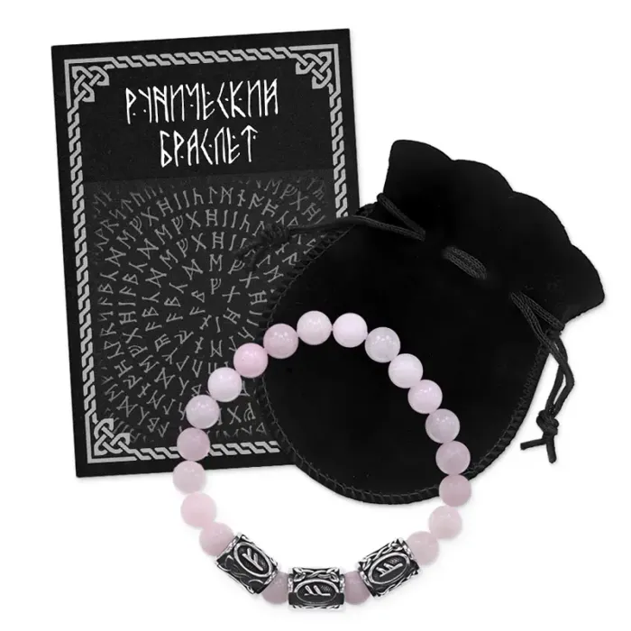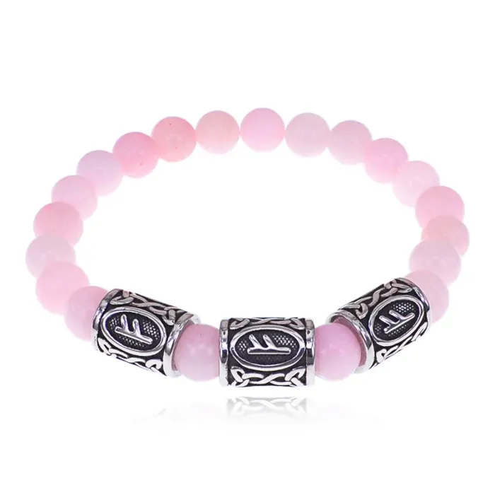 Стрейч-браслет ручной работы из розового кварца и рунических бусин из нержавеющей стали.