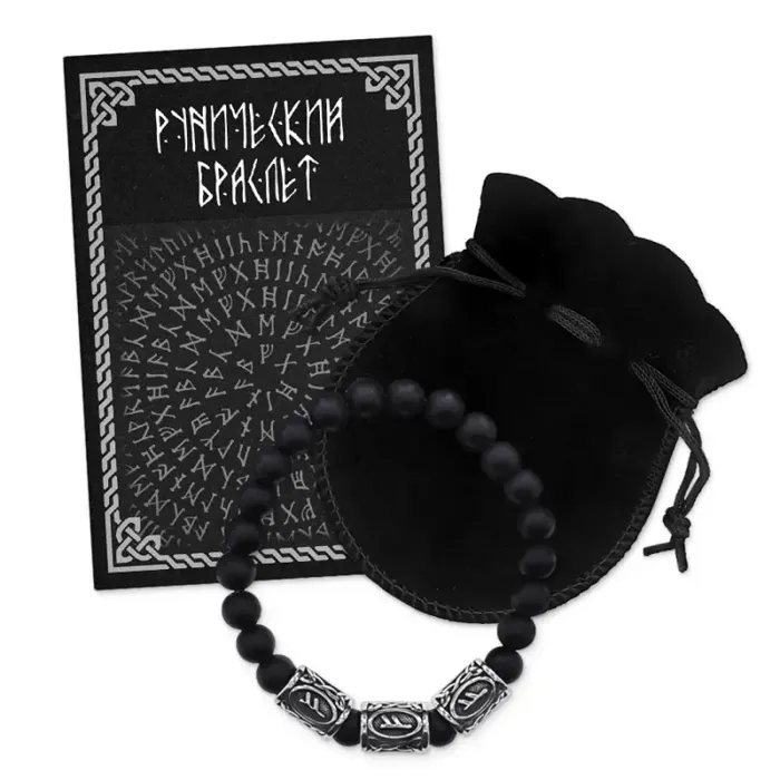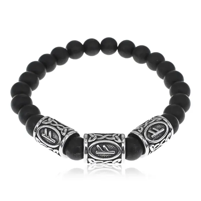 Стрейч-браслет ручной работы из шунгита и рунических бусин из нержавеющей стали.