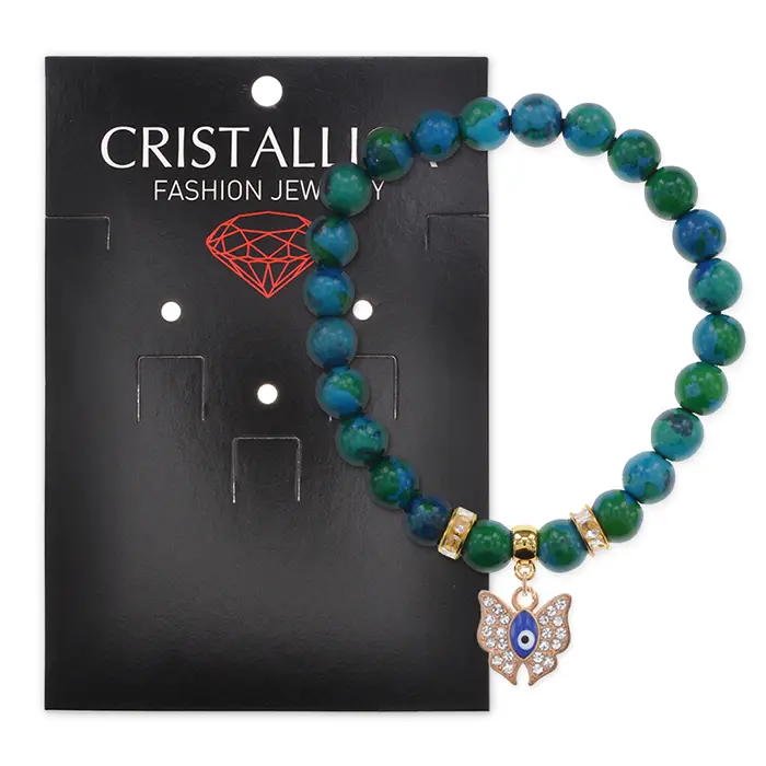 Стрейч-браслет из синтетического камня хризоколла с подвеской в виде бабочки.