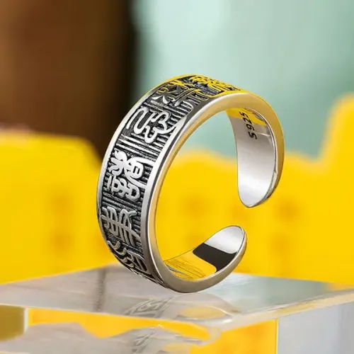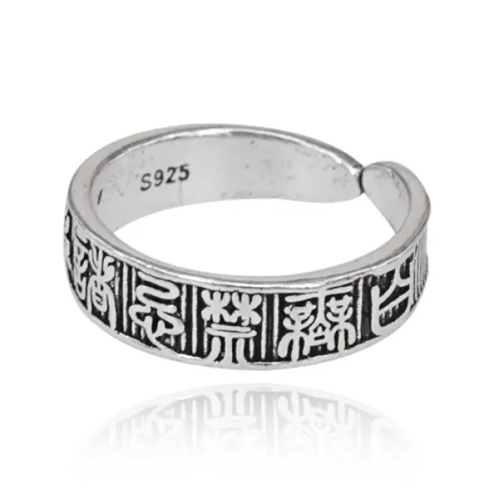 Безразмерное кольцо с иероглифами. Изготовлено из металла с покрытием под серебро.