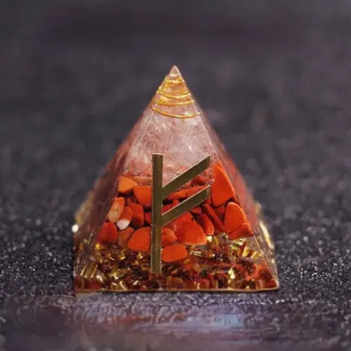 Сувенирная фигурка в виде пирамиды с нанесённой руной Феху. Изготовлена из эпоксидной смолы.