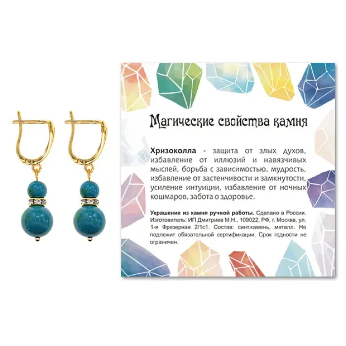 Материал и изготовление: Синтетический камень хризоколла, бижутерный сплав с покрытием под золото. Изделие ручной работы.