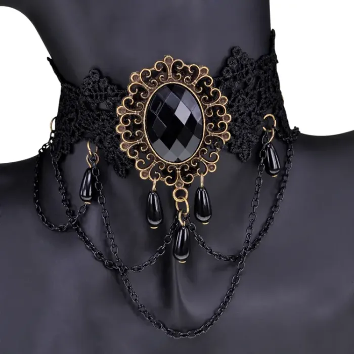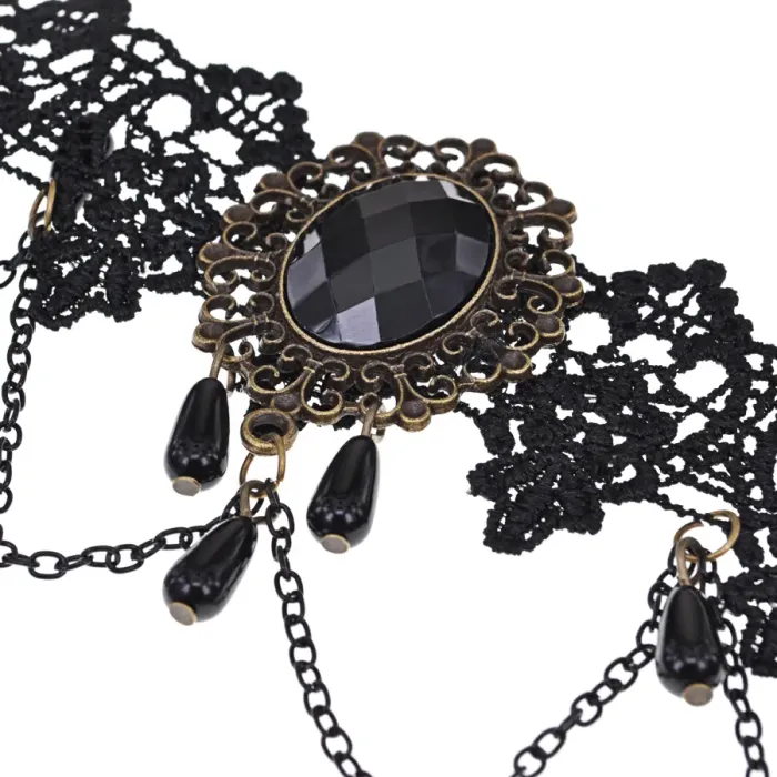 Кружевной чокер длиной 35 см с металлическими деталями под бронзу и текстильными вставками.