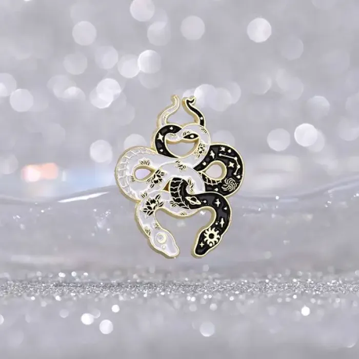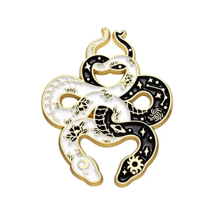 Металлический значок с эмалевым покрытием и дизайном в виде двух змей.