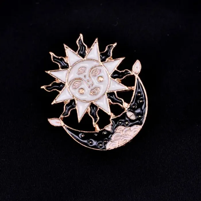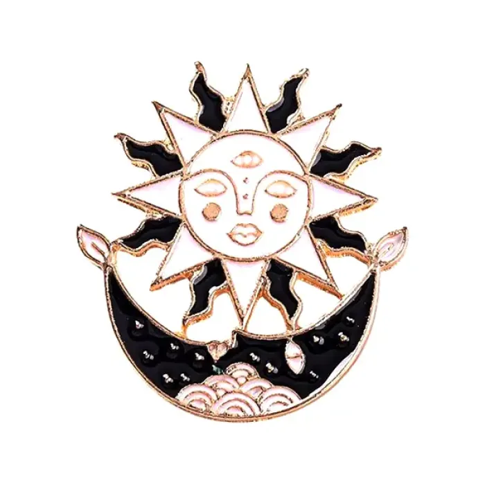 Металлический значок с эмалевым покрытием и дизайном в виде месяца и солнца.