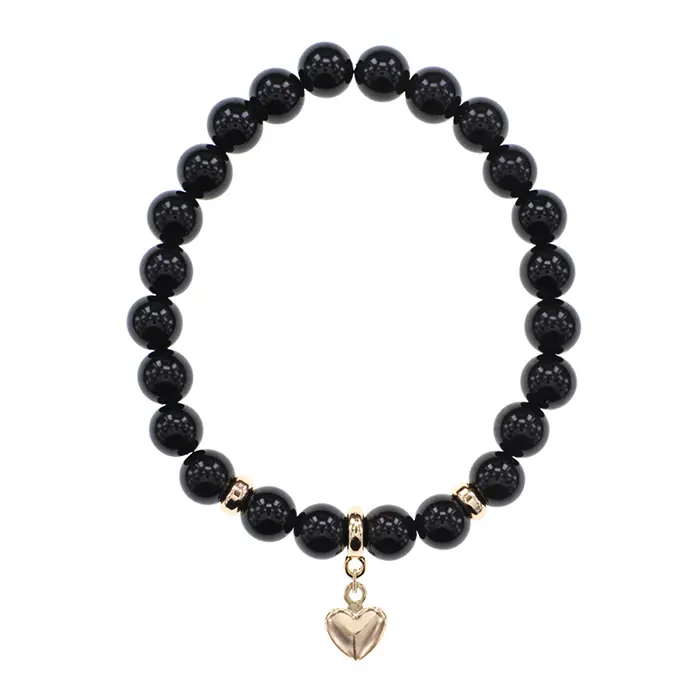 Стрейч-браслет с бусинами из натурального черного агата и родиевым покрытием. Дизайн включает подвеску в форме сердца.