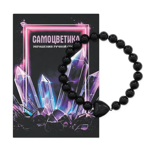 Стрейч-браслет ручной сборки из бусин натурального чёрного агата диаметром 8 мм с подвеской в форме сердца.