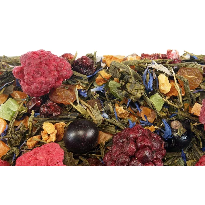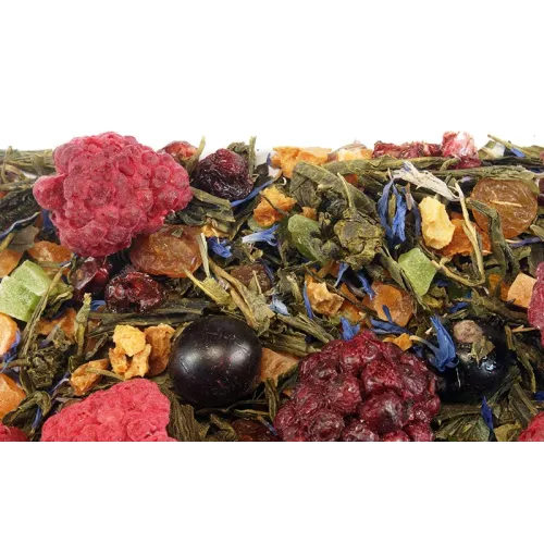 Состав: Чай зелёный листовой крупный, улун (оолонг) листовой крупный, абрикос, ананас (цукаты), василёк (лепестки), ежевика, изюм, малина, красная смородина, чёрная смородина, натуральные ароматизаторы