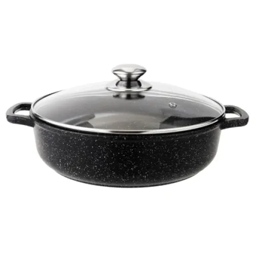 Корпус из литого алюминия обладает прочностью и устойчивостью к деформации. Антипригарное покрытие препятствует пригоранию пищи и облегчает мытьё. Конструкция включает толстое дно для эффективного нагрева и стеклянную крышку, позволяющую визуально контролировать процесс готовки.