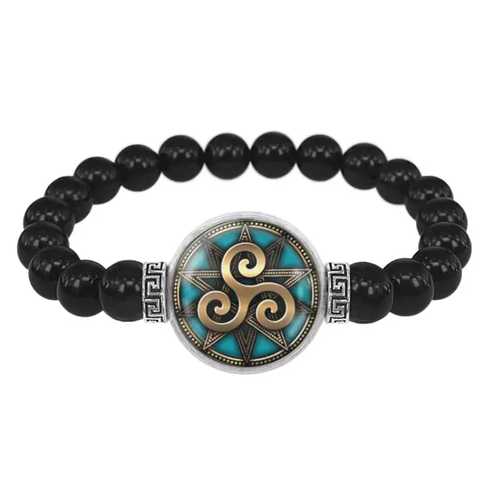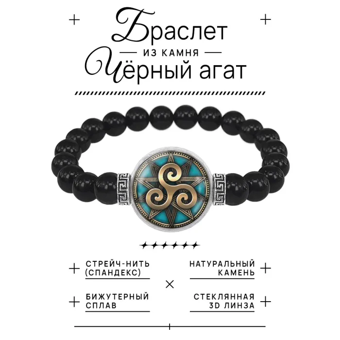 Стрейч-браслет из бусин чёрного агата с центральным элементом в виде амулета Трискель под выпуклой стеклянной линзой.