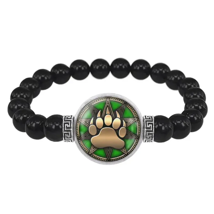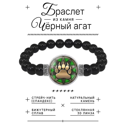 Стрейч-браслет из черного агата с кулоном «Печать Велеса» под стеклянной линзой.