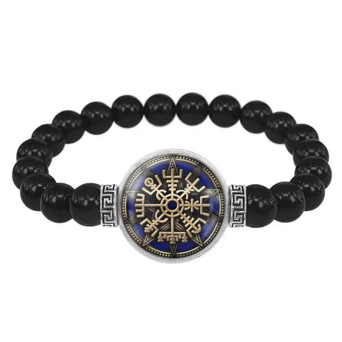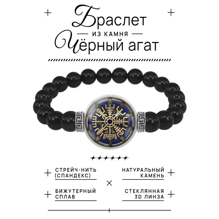 Стрейч-браслет с амулетом Вегвизир из бусин черного агата и бижутерного сплава.