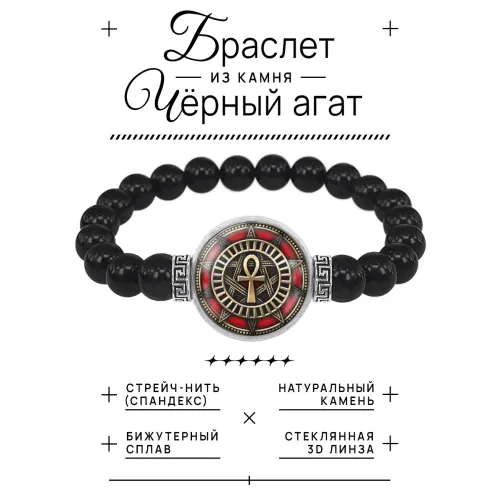 Стрейч-браслет с символом Анкх из черного агата и бижутерного сплава.