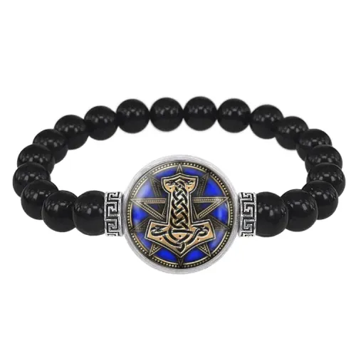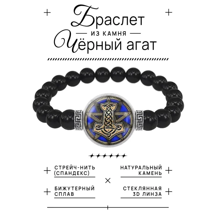 Стрейч-браслет-амулет из чёрного агата с центральным элементом в виде Молота Тора под выпуклой стеклянной линзой.
