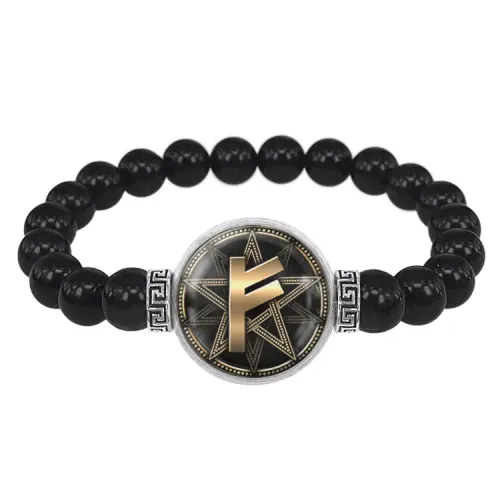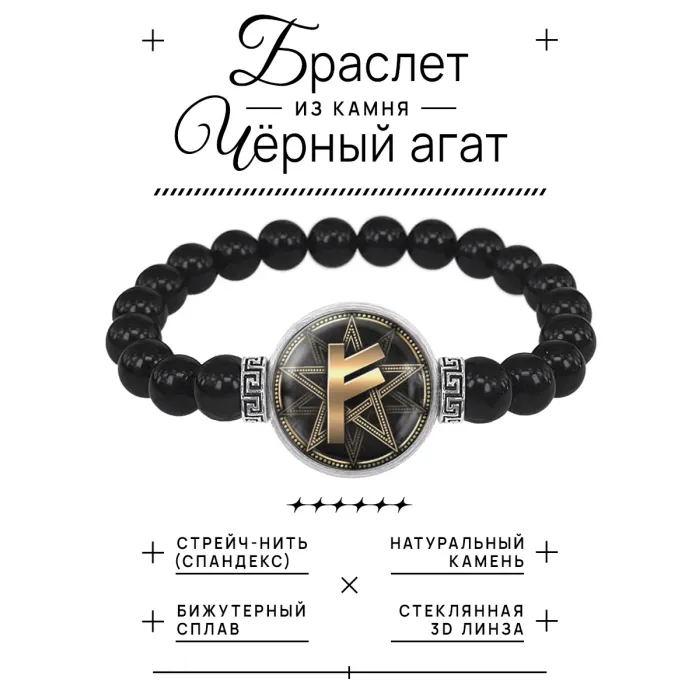 Стрейч-браслет с руническим амулетом Феху из бусин черного агата и бижутерного сплава.