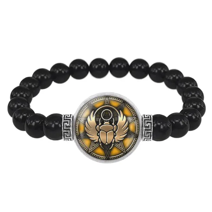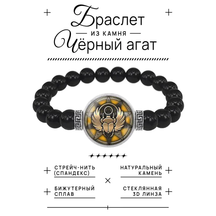 Стрейч-браслет из бусин чёрного агата с центральным элементом в виде амулета Крылатый скарабей под выпуклой стеклянной линзой.
