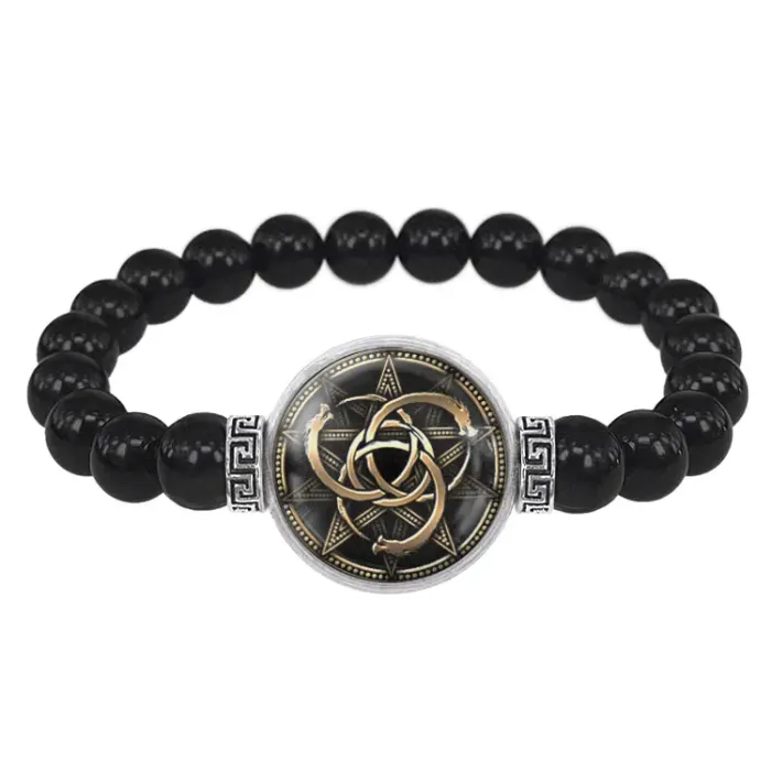 Стрейч-браслет с амулетом Уроборос из черного агата и бижутерного сплава.
