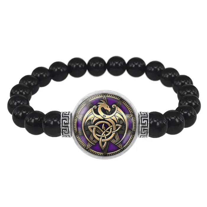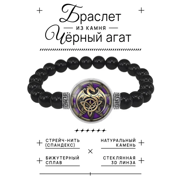 Стрейч-браслет из бусин чёрного агата с декоративным элементом «Кельтский дракон» под выпуклой стеклянной линзой.