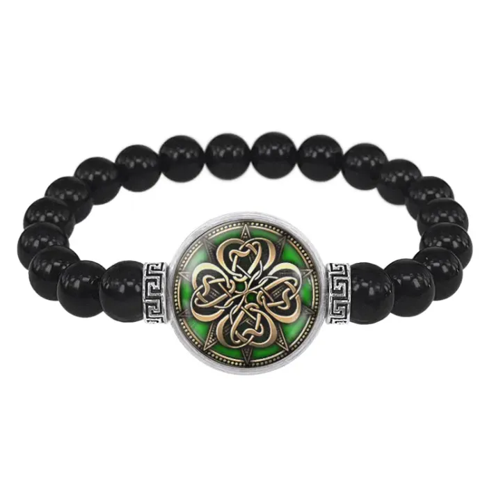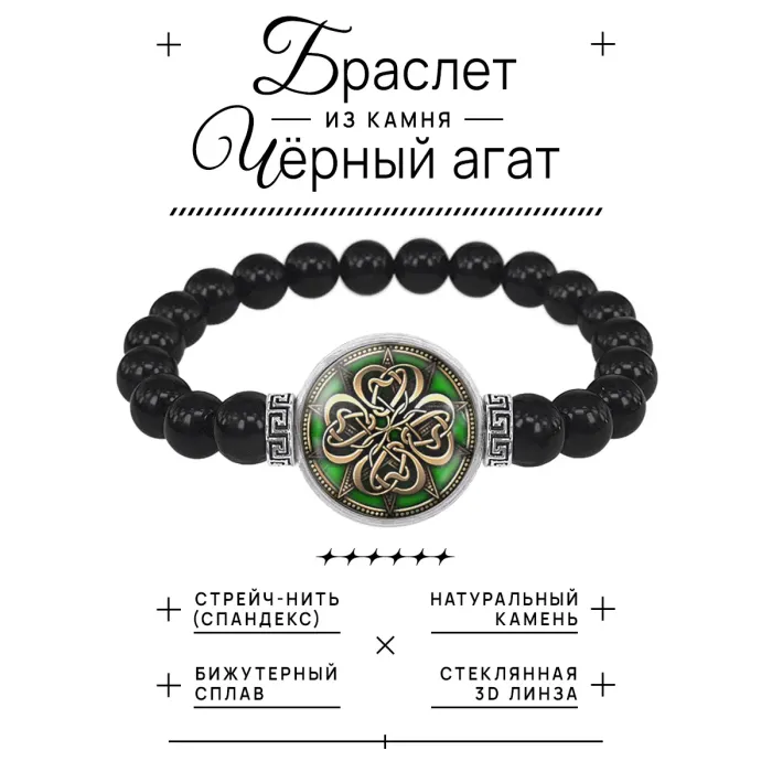 Стрейч-браслет из чёрного агата с центральным элементом в виде четырёхлистного клевера под стеклянной линзой.