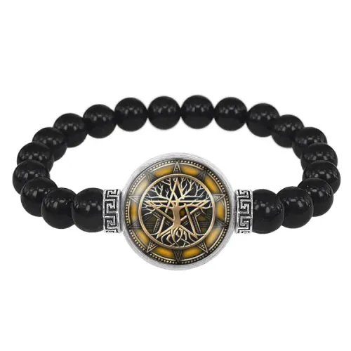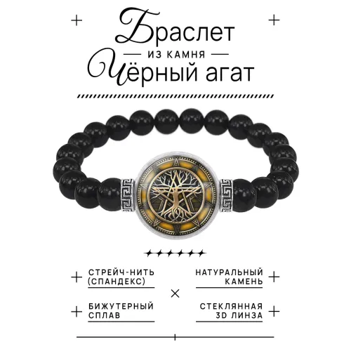 Стрейч-браслет из натурального черного агата с центральным элементом в виде амулета Дерево жизни под выпуклой стеклянной линзой.