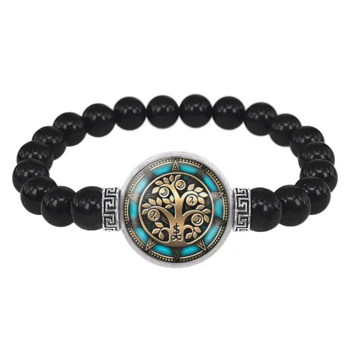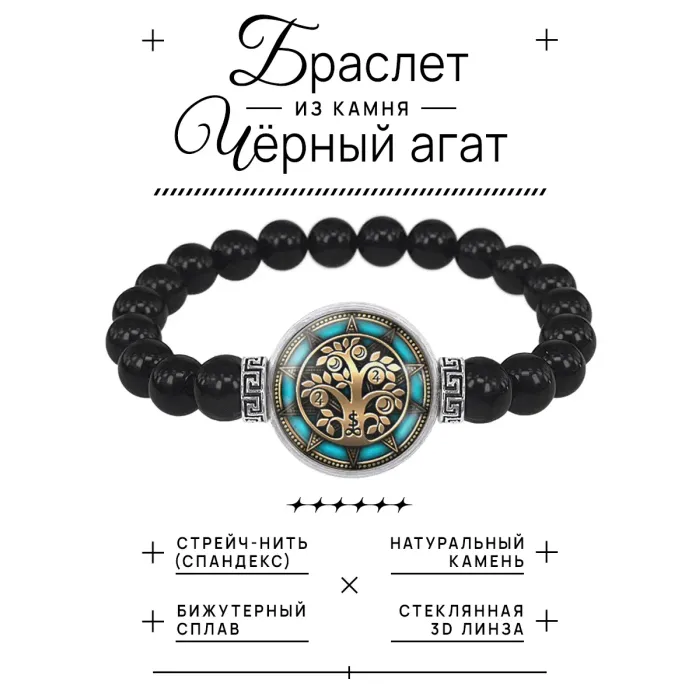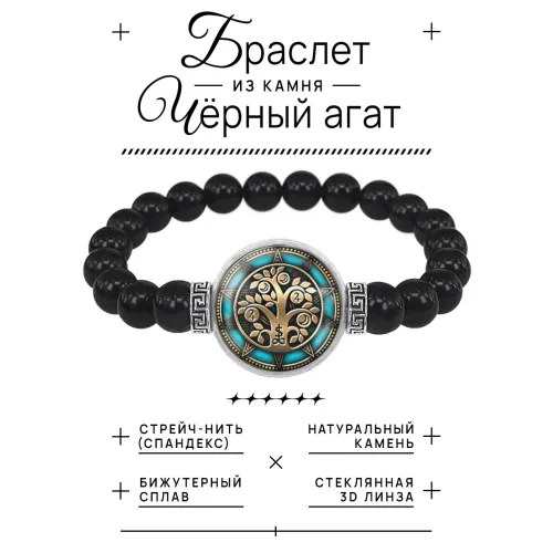 Стрейч-браслет из натурального чёрного агата с центральным элементом в виде амулета под стеклянной линзой.