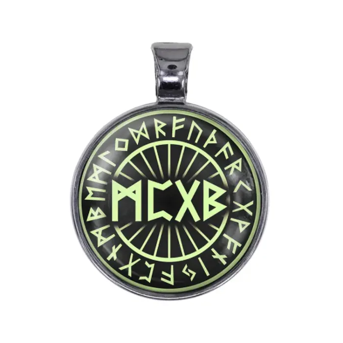 Светящийся в темноте кулон-амулет для ношения. Изготовлен из бижутерного сплава с покрытием под сталь, имеет выпуклую стеклянную линзу.