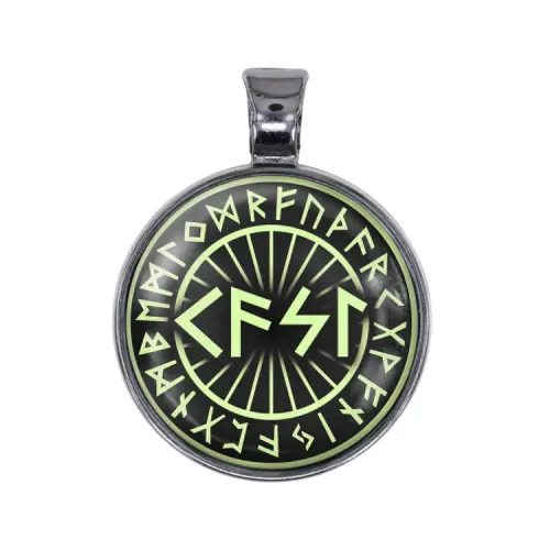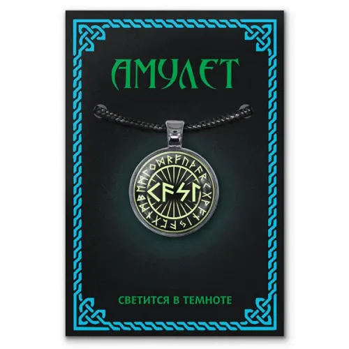 Сувенирный кулон-амулет из бижутерного сплава со светящимся элементом и выпуклой защитной линзой.