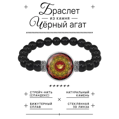 Стрейч-браслет из бусин чёрного агата с декоративным элементом под выпуклой стеклянной линзой.