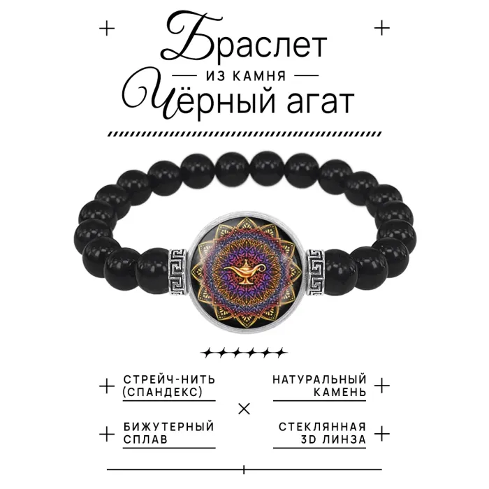 Стрейч-браслет из бусин чёрного агата с центральным элементом в виде амулета под стеклянной линзой.