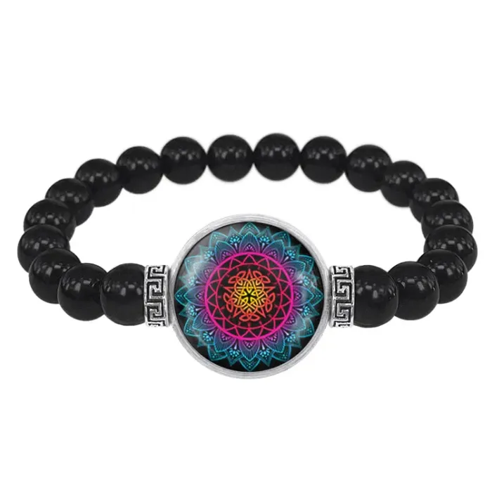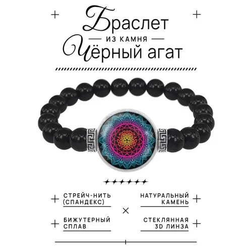 Стрейч-браслет из бусин чёрного агата с изображением мандалы под выпуклой стеклянной линзой.