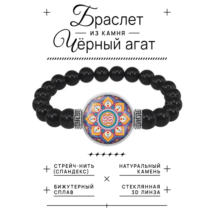 Стрейч-браслет из бусин чёрного агата с центральным медальоном под выпуклой стеклянной линзой.
