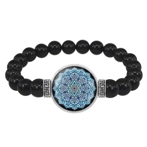 Стрейч-браслет из бусин чёрного агата с кулоном, украшенным изображением под выпуклой стеклянной линзой.