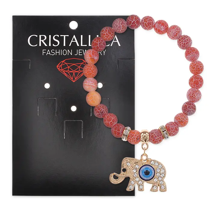 Браслет из натурального африканского агата с подвеской в виде слона. Дизайн дополнен стразами и фурнитурой светлого золота.