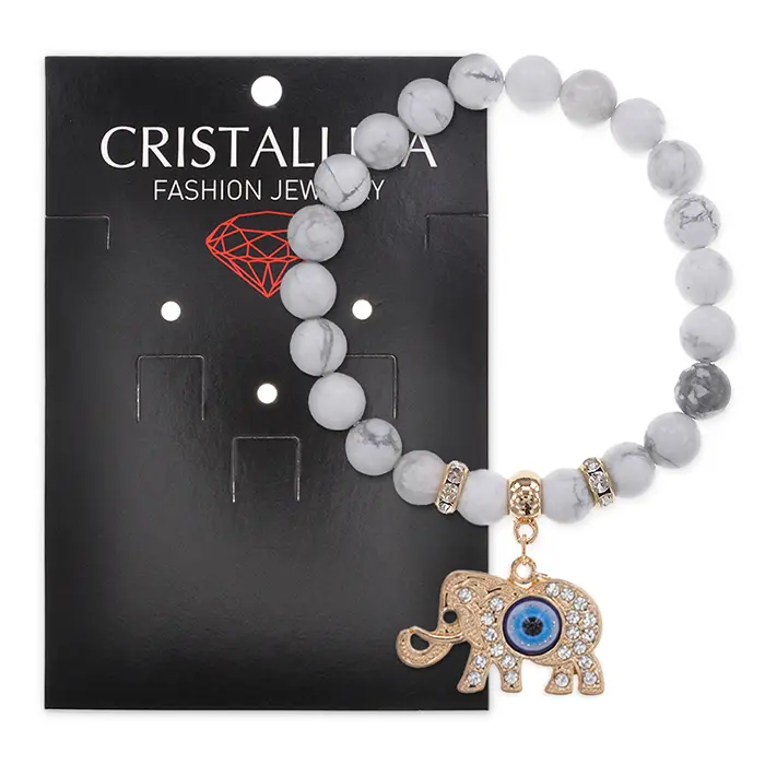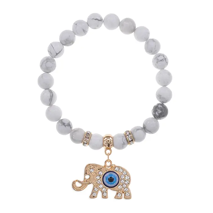 Браслет из натурального камня кахолонг с бусинами 8 мм, украшенный декоративным элементом в виде слона и стразами.