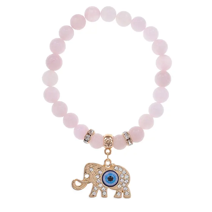 Стрейч-браслет из натурального розового кварца с подвеской в виде слона.