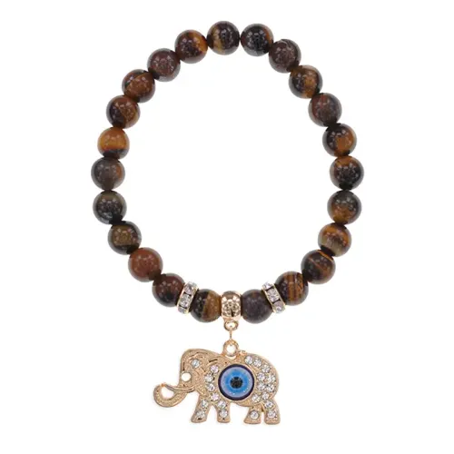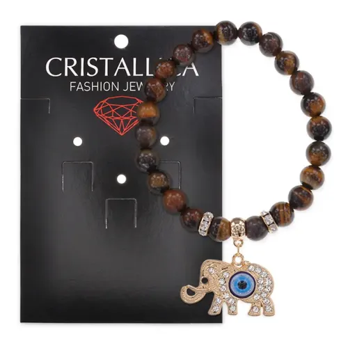 Браслет из натурального камня тигровый глаз с декоративным элементом в виде слона и стразами.