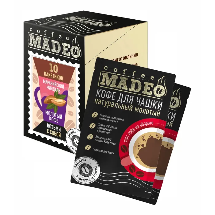 Десертный кофе Madeo «Маравийский миндаль» — это 100% арабика из стран Латинской Америки. Средняя обжарка раскрывает мягкие ноты сладкого миндаля и маслянистой карамели, создавая сбалансированный напиток с плотным телом и средней горчинкой.