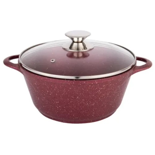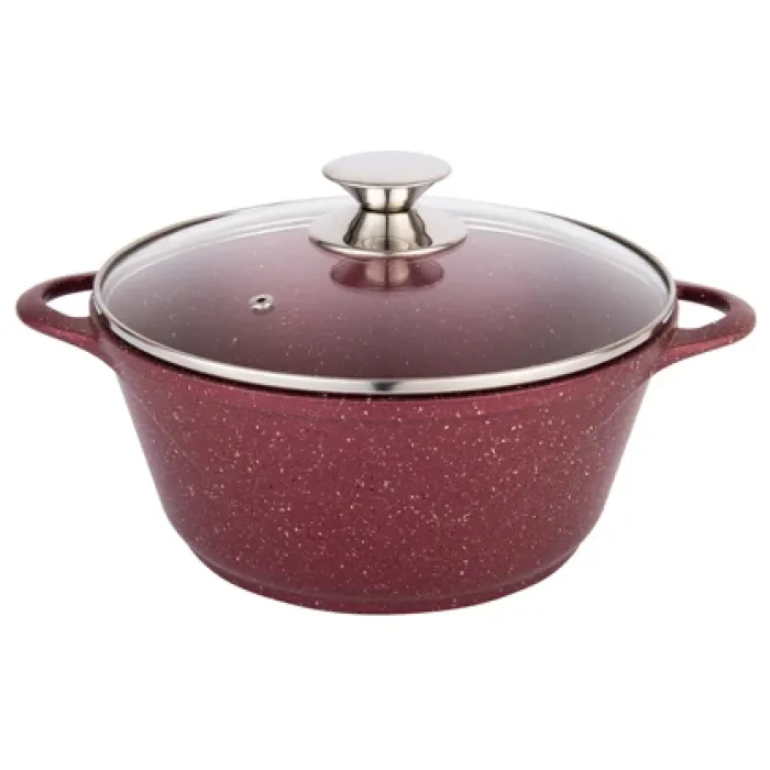 Корпус кастрюли выполнен методом литья из алюминия, что придает конструкции прочность. Толстые стенки и дно способствуют стабильному распределению температуры. Стеклянная крышка позволяет визуально контролировать процесс приготовления. Ручки закреплены на корпусе для безопасного перемещения.