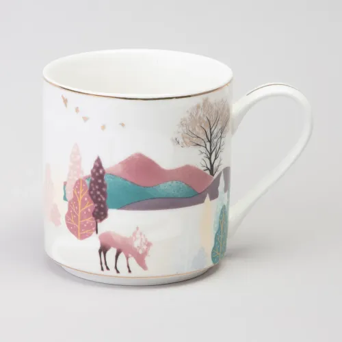 Кружка выполнена из фарфора, материала, известного своей гигиеничностью и устойчивостью к появлению пятен. Поверхность украшена декором в виде горного пейзажа с золотыми элементами. Ручка имеет классическую форму для удобного захвата.