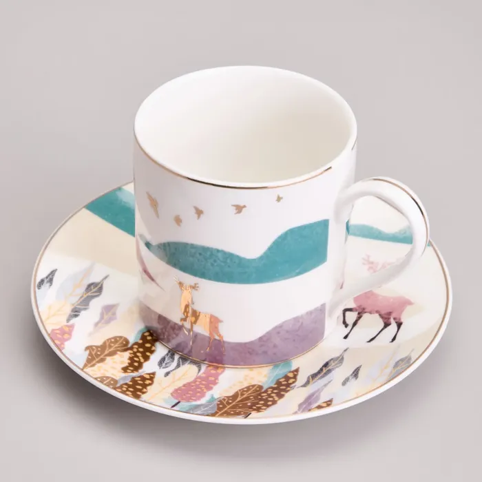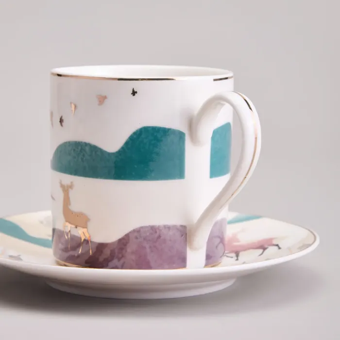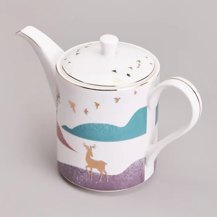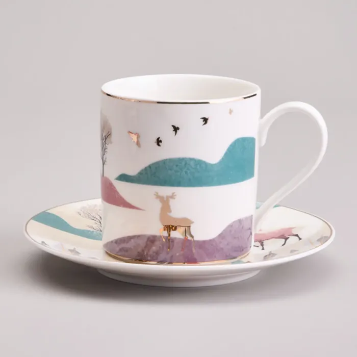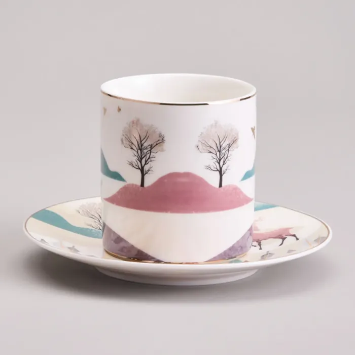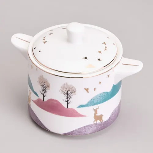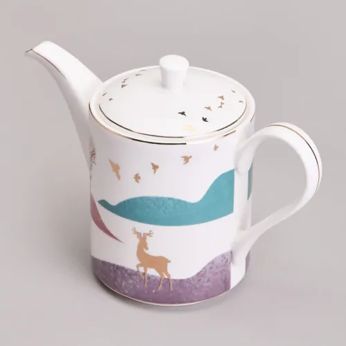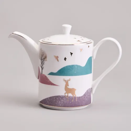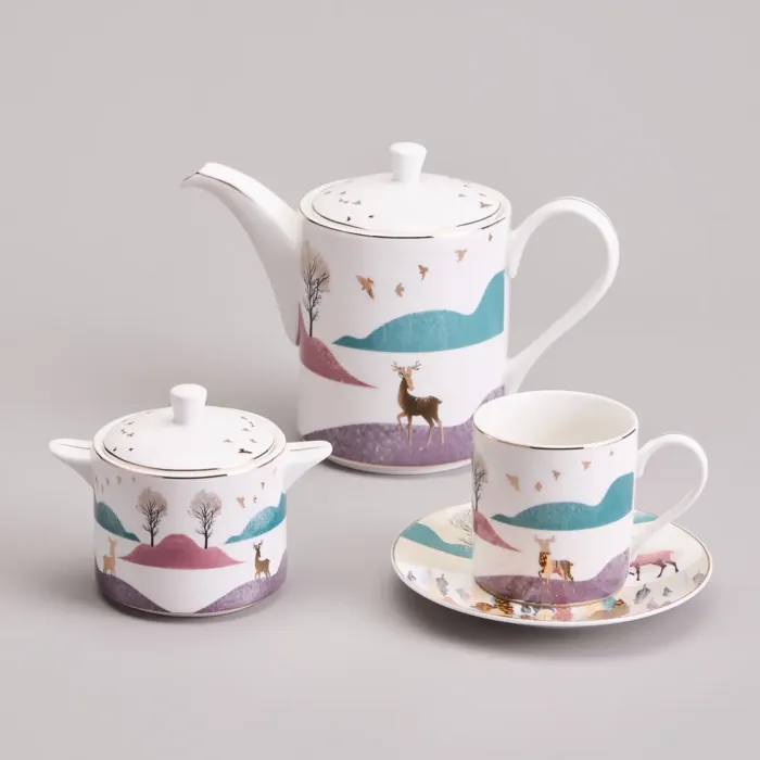 Предметы сервиза выполнены из высококачественного фарфора, что обеспечивает прочность и гигиеничность. Изделия имеют сертификацию, подтверждающую безопасность для контакта с пищевыми продуктами. Дизайн включает чёткие линии, изображение горного пейзажа и декоративные золотые детали.